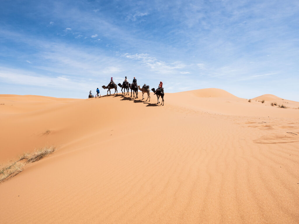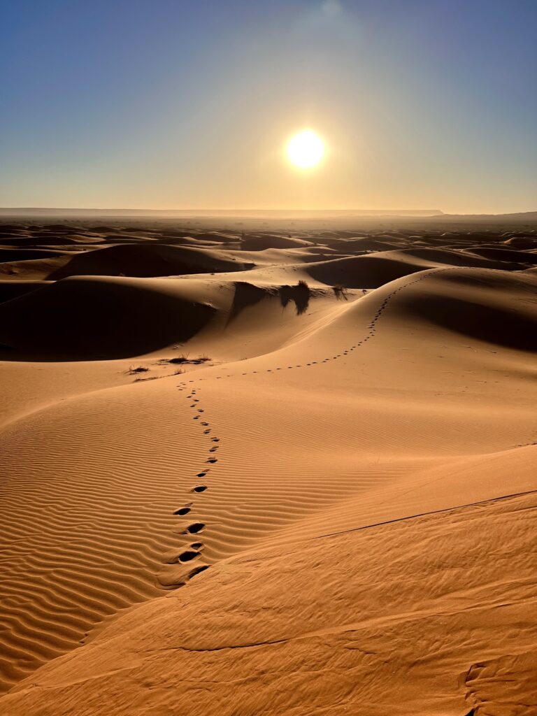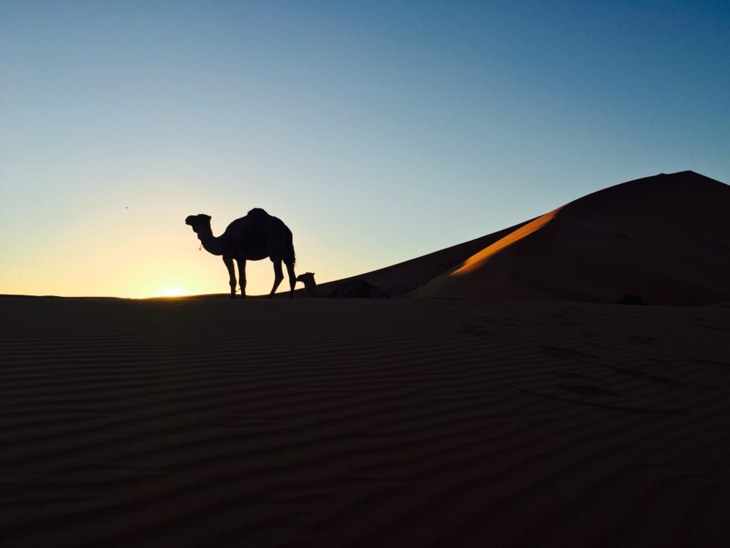 Am Vormittag reiten wir auf unseren Kamelen zu unserem Wüstencamp (auch als Wanderung oder mit Fahrzeug möglich). Dort erwartet uns ein herrlich frisches Mittagessen und die Familie Oussidi, die uns während unseres Aufenthalts in der Wüste umsorgen wird. Nachdem wir uns im Camp eingerichtet haben, begeben wir uns zu unserer ersten Yogastunde in der Wüste. Lass die Wüste auf dich wirken und tauche in die Stille ein.