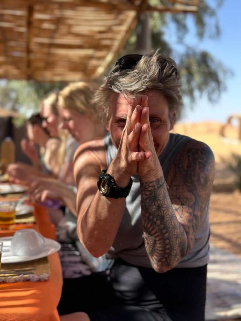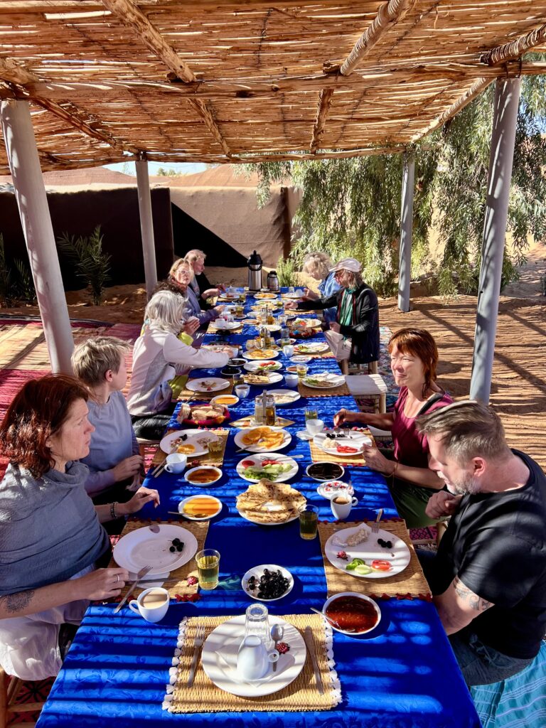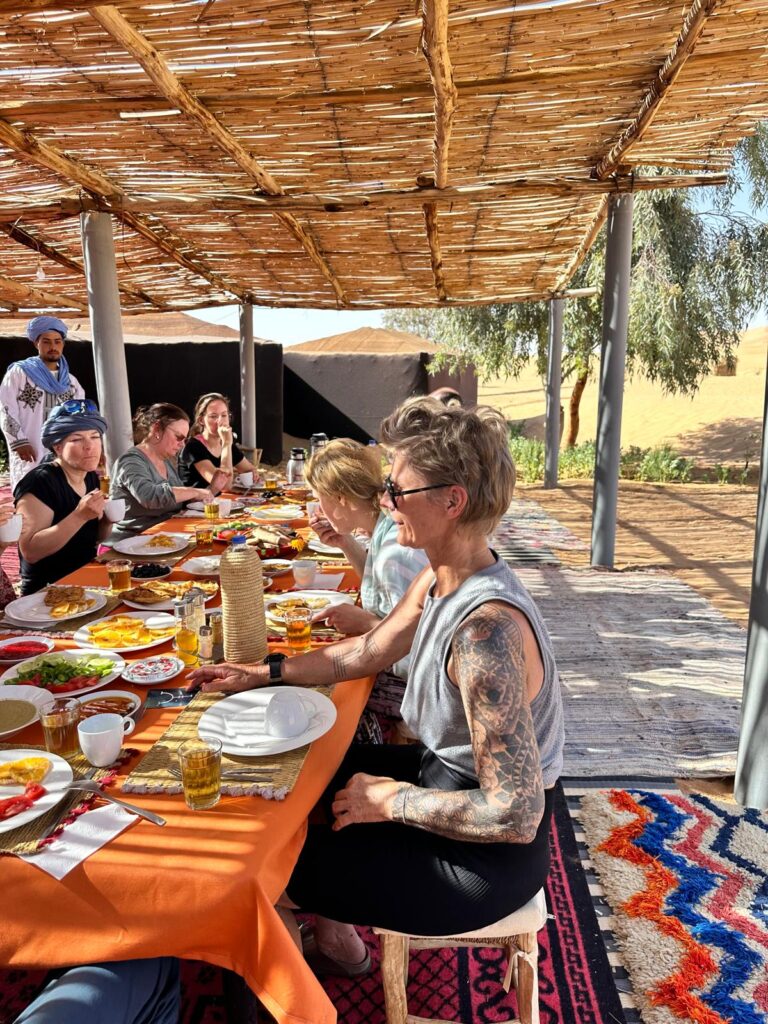 Nun beginnt die individuelle Zeit. Wonach ist dir? Die Möglichkeiten sind groß. Höre den Geschichten von Barak über Marokko und der Wüste zu. Tausche dich in der Gemeinschaft aus, lese an einem schattigen Ort, lausche der Stille in Meditation oder genieße einen Wüstenspaziergang bis zu „Baraks Düne“.