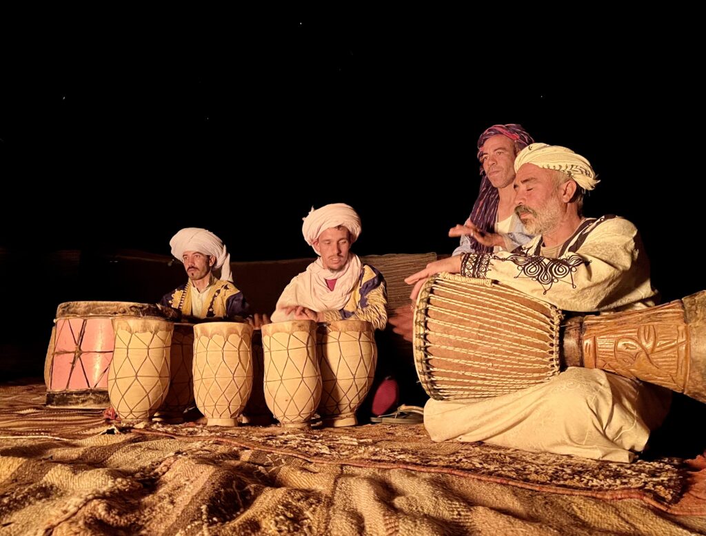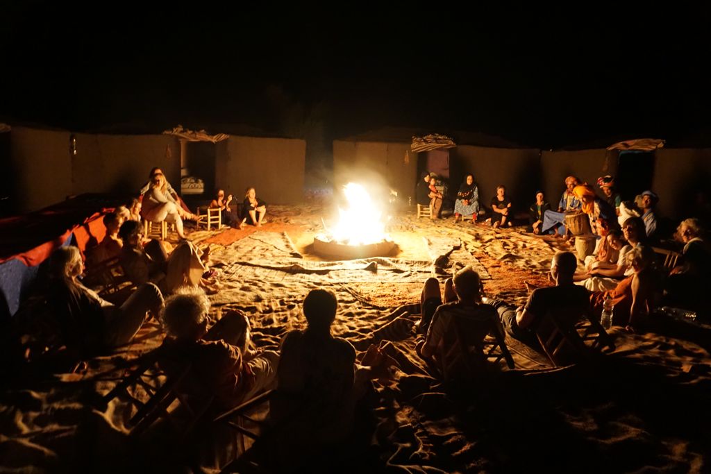 Mit dem Wüstengong wird das Mittagessen eingeläutet und du wirst mit traditionellen Berberköstlichkeiten verwöhnt. Bis zur abendlichen Yogastunde ist nun wieder deine individuelle Zeit. Nach der Yogastunde warten Baraks Neffen mit Trommeln am knisternden Lagerfeuer, während in der Küche bereits das Abendessen zubereitet wird.